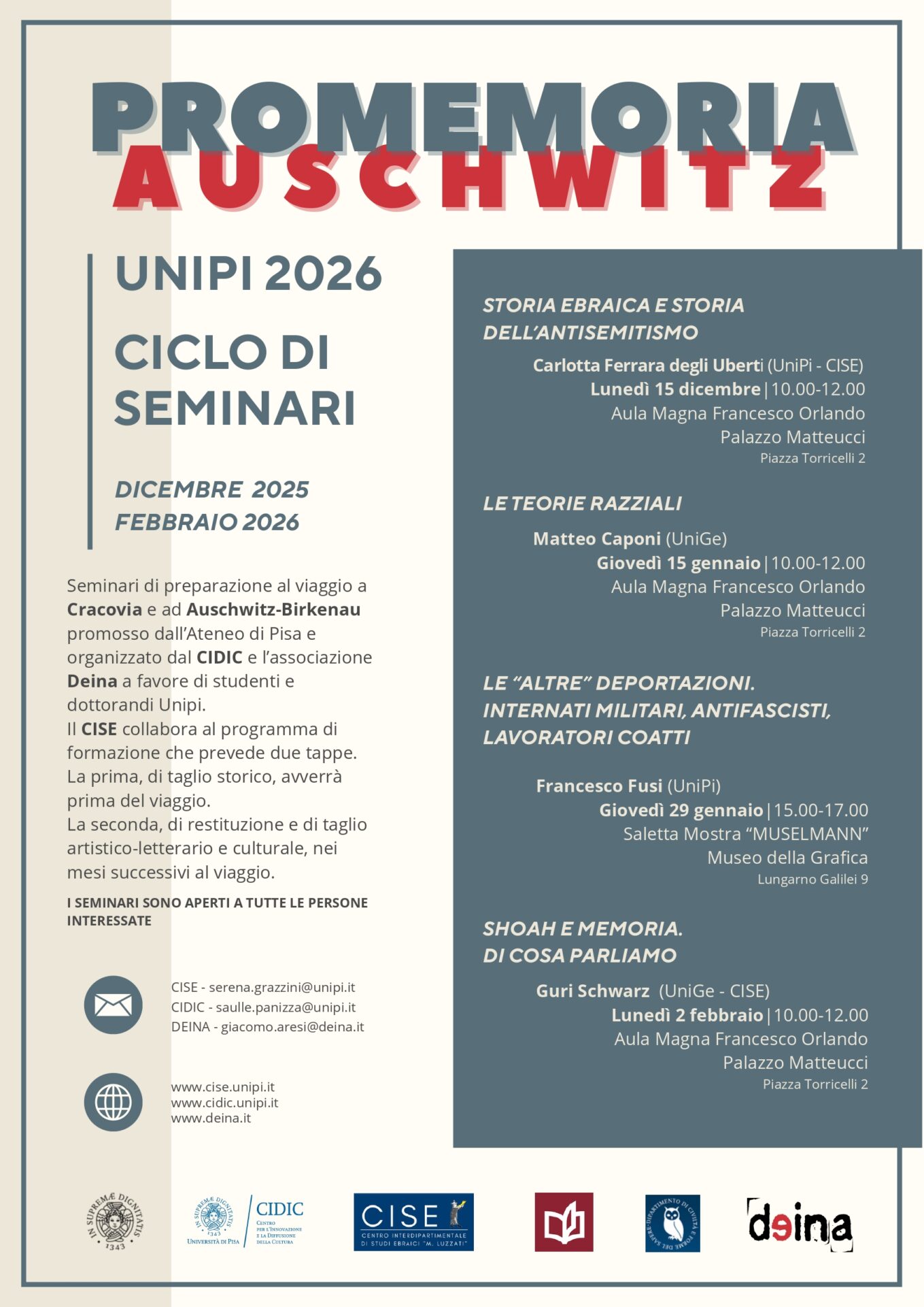 Nell’ambito della mostra Muselmann al Museo della Grafica si terrà il terzo dei quattro seminari realizzati in occasione del viaggio di studenti e dottorandi dell’Università di Pisa a Cracovia e ad Auschwitz-Birkenau organizzato dal Centro per l’Innovazione e la diffusione della cultura Unipi (CIDIC) in collaborazione con l’Associazione DEINA, il CISE collabora al programma di formazione e propone un ciclo di lezioni/seminari aperto a tutte le persone interessate.