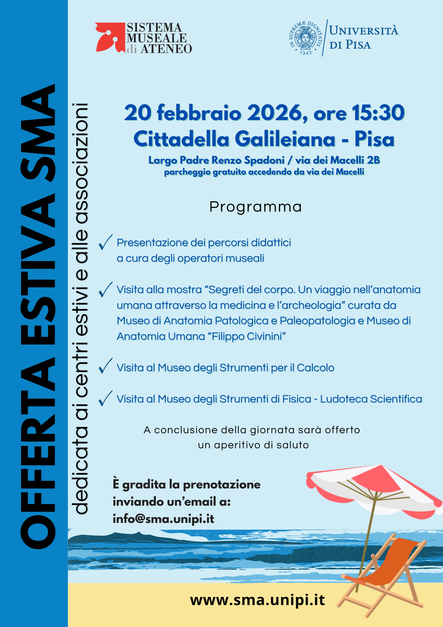 - Presentazione dei percorsi didattici a cura degli operatori dei musei SMA: Collezioni Egittologiche “Edda Bresciani”, GIARA-Gipsoteca di Arte Antica e Antiquarium, Museo degli Strumenti di Fisica-Ludoteca Scientifica, Museo degli Strumenti per il Calcolo, Museo della Grafica, Museo Anatomico Veterinario, Museo di Anatomia Patologica e Paleopatologia, Museo di Anatomia Umana “Filippo Civinini”, Orto e Museo Botanico.